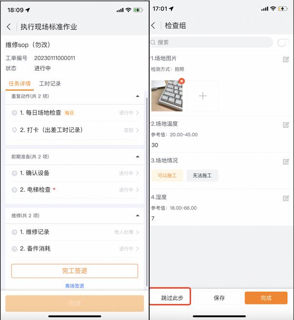 工程师执行现场作业步骤时,可以当前跳过当前动作(app),进入执行下个动作。