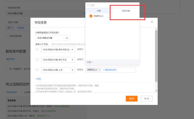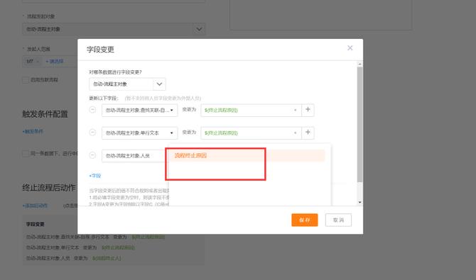 在业务流程-终止流程后动作中选择【字段变更】时,支持选择终止原因及终止人变量;配置后,在终止流程后动作详细内容中,展示配置的字段变更内容。