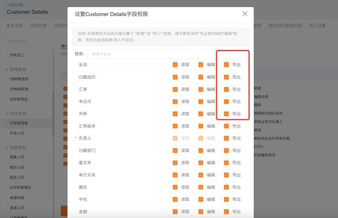 在功能权限-字段权限下支持【导出】限制配置。当进行导出操作时,根据字段导出权限的设置进行导出。