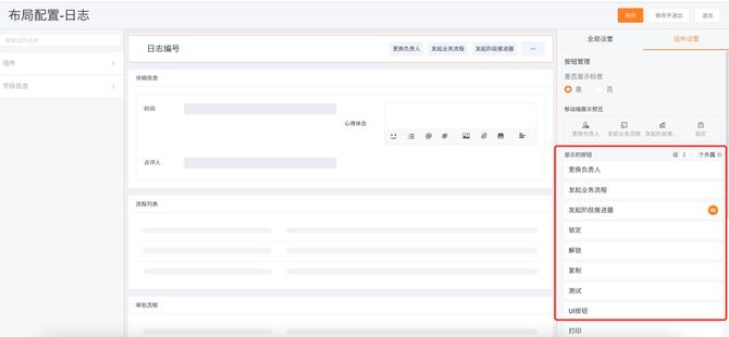 预设对象—日志/销售记录的列表页/详情页布局配置中支持自定义按钮配置,可配置想要展示的按钮及按钮排序。