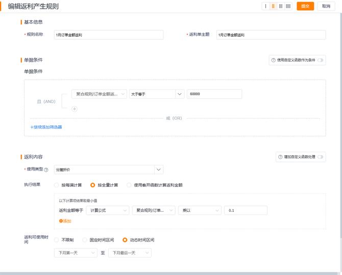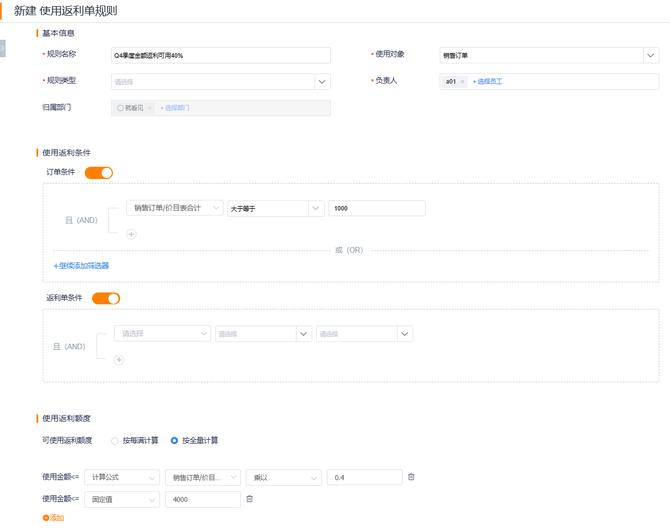 (2)定义【使用返利规则】 可限定订单上使用返利单的门槛条件、能使用哪些返利、以及使用额度