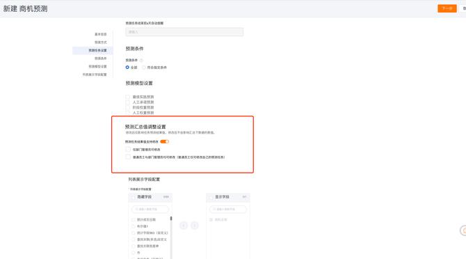 (1)后台配置:预测汇总值调整设置,开启后,支持两种配置方式:仅部门管理员可修改、普通员工与部门管理者均可修改