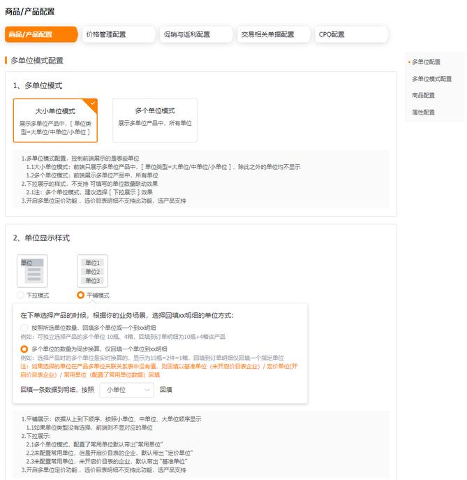 (1)增加多单位模式配置开关:控制前端展示的是【大/中/小单位】还是产品关联的【所有单位】;