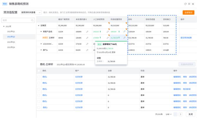 商机预测个人预测任务值、部门预测任务值支持可调整。