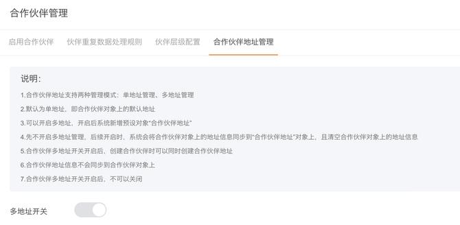 (1)合作伙伴支持多地址管理,受开关控制,开启后新增“合作伙伴地址”。