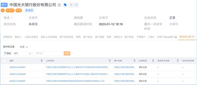(3)补齐查询到的标讯数据批量转存场景:新增【招中标记录】中间对象承载,可通过1个字段区分出“客户作为招标单位关联的标讯”和“客户作为中标单位关联的标讯”;