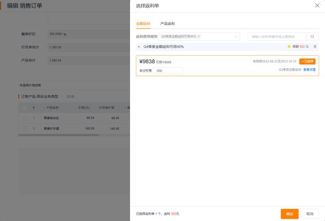 (3)订单上可在使用规则范围内使用返利,减小待回款额,并分摊到各产品行