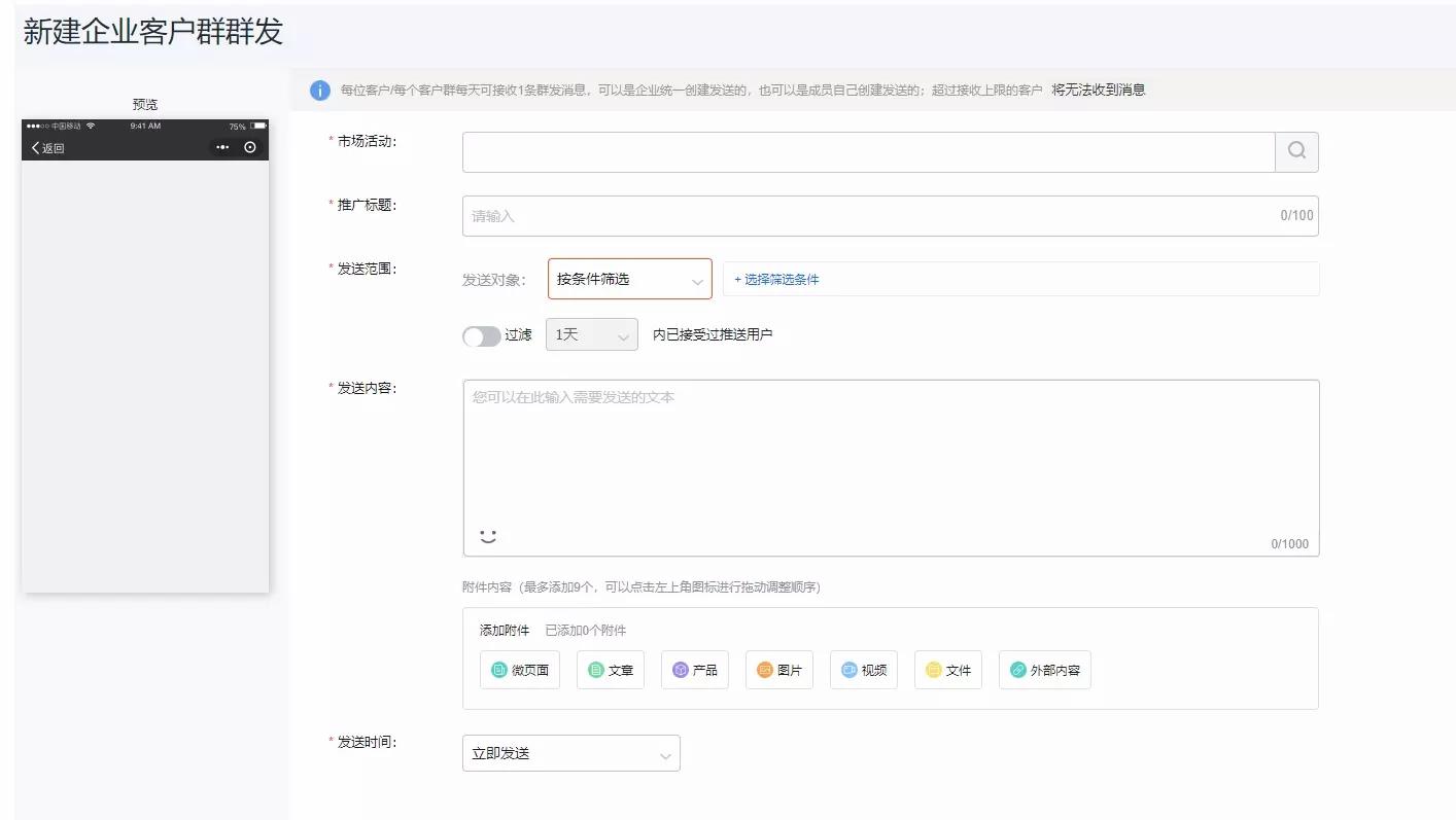 使用场景:管理人员可以基于不同的客户群进行不同的运营策略,设置统一内容,下发任务给员工,进行群发 。