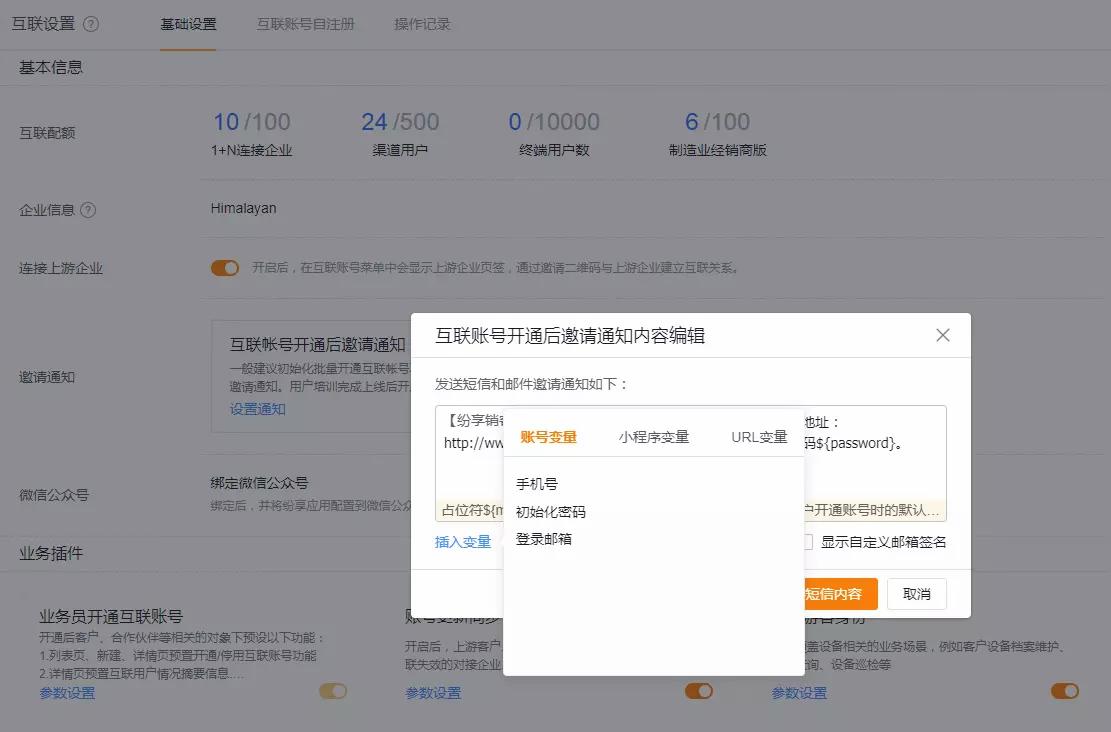功能介绍:互联账号开通后邀请通知、邀请未激活的互联用户通知升级插入变量能力。支持三种变量信息: