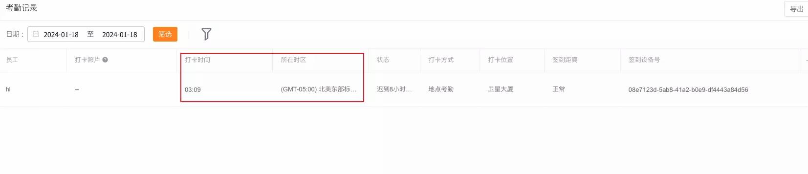 2、考勤记录中新增「所在时区」字段,显示个人所在时区,同时打卡时间将按照打卡人时区时间进行显示