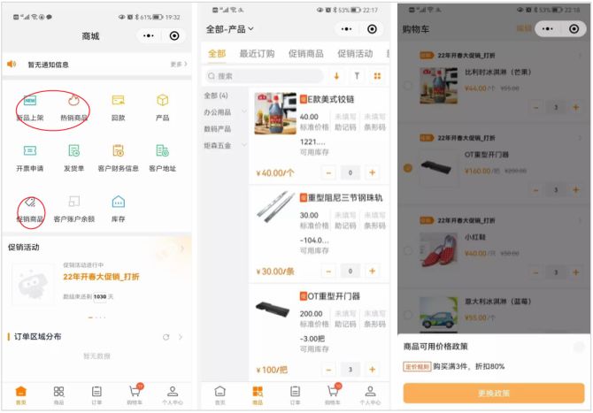 订货商城已完整适配新促销(价格政策),经销商在首页中可查看促销产品、促销活动,在商品列表也可查看具体商品的促销规则,购物车结算会自动计算促销结果,支持切换促销和赠品等。