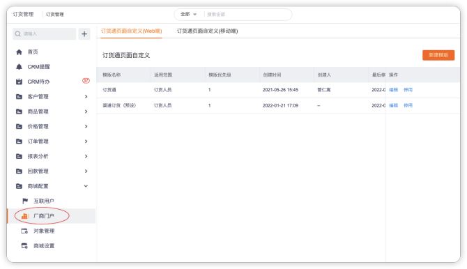 企业可根据需要配置Web渠道门户和移动门户,可灵活设置商城的首页、菜单、工具栏等,支持向下游开放CRM自定义对象、BI统计图/报表和自定义页面。移动门户还支持底导航配置,可根据需要调整底导航或屏蔽导航。