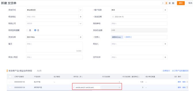 开启相关的参数后,将支持一行发货单产品里显示多个序列号(受限于PAAS的限制,每行最多支持10个)。