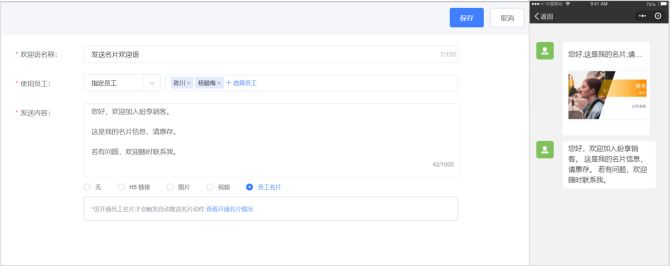 支持在营销通配置加好友欢迎语,可以设置不同员工使用不同的欢迎语包括文本、图片、小程序内容等,支持加好友后自动发送员工名片。