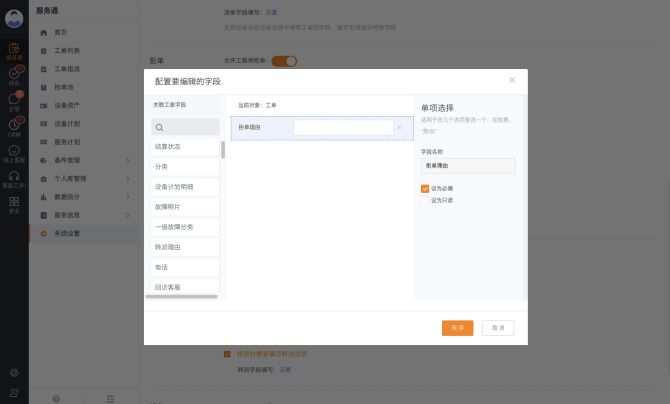 拒单/转单允许设置填写工单对象字段,方便统计拒单/转单原因。