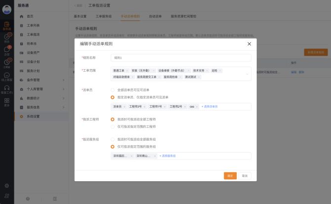 手动派单新增规则限制,可设置指定派单员和指定工程师/服务组/服务商。