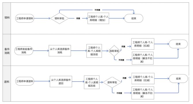 从个人库的备件库存中进行备件消耗、备件退料和备件调拨增加冻结状态,流程完成后从冻结数量中扣减。
